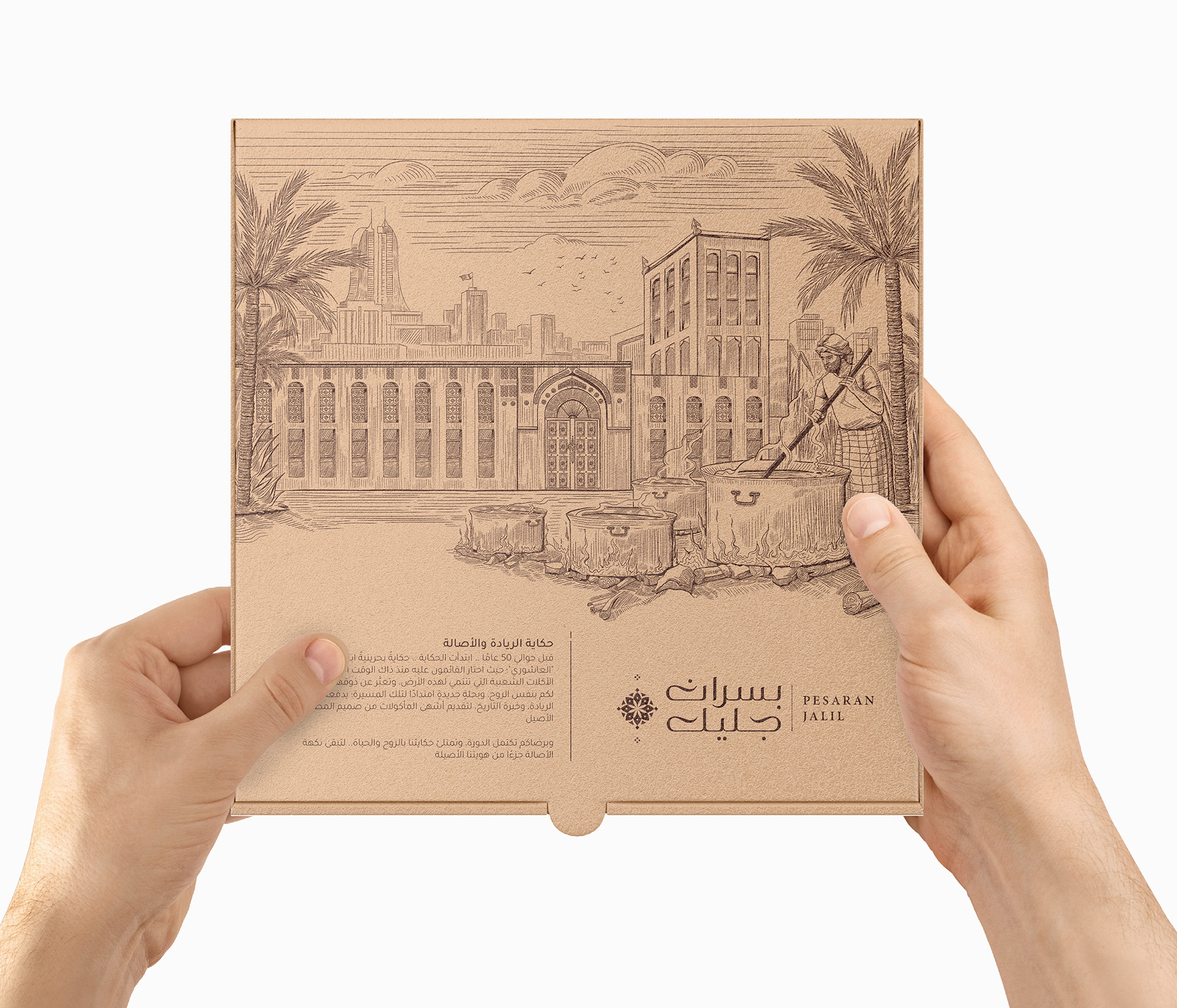 Pesaran Jalil WLL is a Bahraini family-owned restaurant managed by local young team. Specialized in serving traditional Bahraini meals like sea food and rice dishes, cooked with the best and freshest Bahraini market ingredients. The aim was presenting the brand in a modern and elegant way and incorporate it with the Bahraini culture. We’ve sculpted a stunning logo inspired by Bahraini’s historical, antique, and traditional structural behaviors and selected a unique color palette that communicates Bahrain’s nature and environment. We’ve supported the branding journey with authentic packaging and matching collaterals designs.